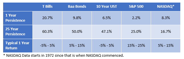 The investor’s need to know and prudent decision-making can be enhanced by a measure of investment persistence. This measure can be applied to individual investments or to classes of investments and relies on the probability of changing returns in the future. Persistence is combined with an evaluation of the factors that have been leading indicators of investment returns and investment losses.